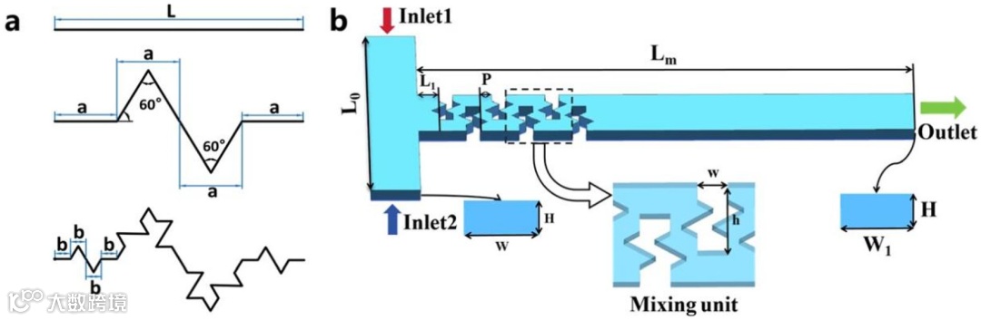 图1. PWFB微混合器的设计模型。(a)海带带分形原理;(b)PWFB微混合器的三维模型。
