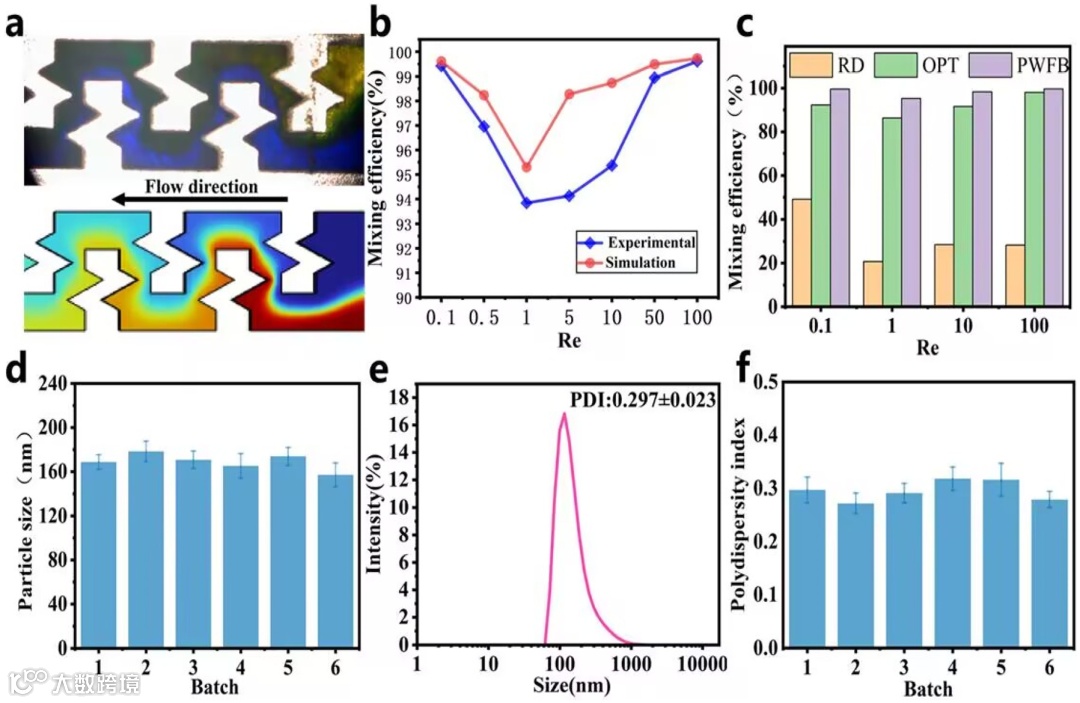 图6. (a)当入口通道的流速为14.76µL/min(Re=1)时,在微通道中混合单元位置的模拟和实验结果的比较。(b)不同Re下的数值模拟和实验结果比较。(c)不同Re下PWFB混合器与简单T形微混合器及Lv等人提出的混合器的混合性能比较。(d)FRR为10的6个批次中脂质体的均径。(e)FRR为10的脂质体尺寸分布(f)FRR为10的6个批次中脂质体的PDI。