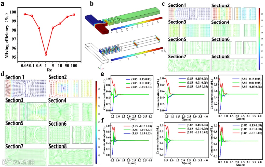 为了进一步研究影响PWFB微混合器混合性能的可能因素,团队对引起微混合器快速混合的因素进行了更深入的研究。确定了PWFB结构对增强分子扩散和混沌对流具有重要作用,显著提高了微混合器的混合性能。通过PWFB微混合器的模拟浓度分布和八个代表性截面,研究了在低Re和高Re时,PWFB微混合器中不同位置的有效混合性能。从沿微通道方向的浓度曲线分布可以看出,PWFB引起的偏转现象对促进混合效率的提高具有重要意义(图4)。