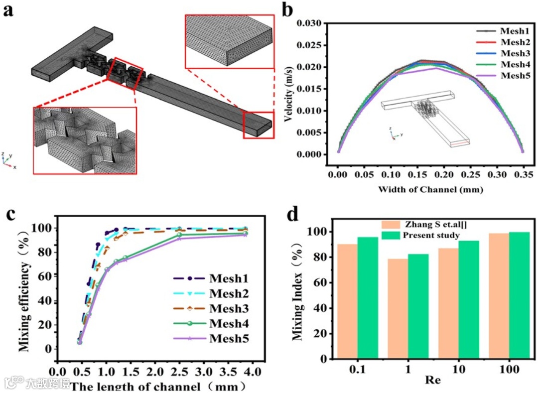 研究团队通过对微混合器模型进行了严格的网格独立性测试,以确保模拟结果的准确性和可靠性。团队通过划分五种不同的网格数,在微通道出口处设置一条三维横截面线,研究不同网格数下横截面线的速度变化,进行了多次测试和比较。此外,团队还研究了不同网格尺寸对混合指数的影响,并将该研究模型的数值结果与引用的其他研究人员的最相似模型进行了比较。通过多方面的验证方法和数据对比分析,保证了研究结果和结论的科学性和可信度,为进一步研究和应用提供了可靠的基础(图2)。