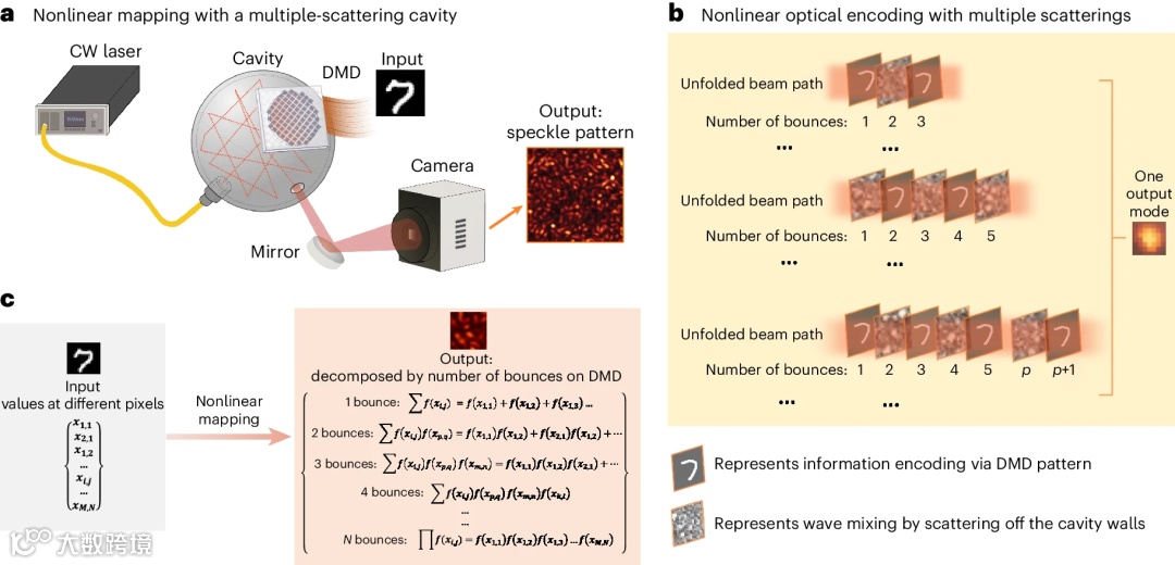研究人员开发了一种更具可控性的方案。他们没有采用随机散射,而是精心设计了一条之字形光路,让光束在带有四个不同输入副本的空间光调制器上散射。每个副本中的像素都可以通过可训练参数进行调节,使系统能像传统神经网络一样进行训练。尽管光只经过四次反射,但已足够产生有效的非线性效应,成功实现了简单的图像分类任务。更重要的是,多次编码的设计使系统具有很强的抗噪能力。