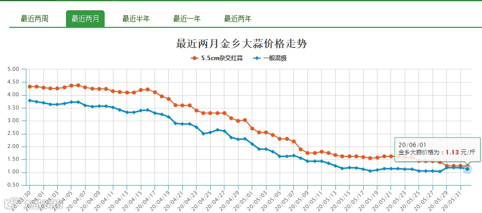 国际大蒜贸易网数据显示,二季度以来,蒜价整体呈现震荡下行走势。以山东金乡地区5.5cm杂交红蒜价格为例,3月31日报价为4.33元/斤,6月1日为1.13元/斤,两月累计跌幅逾70%。