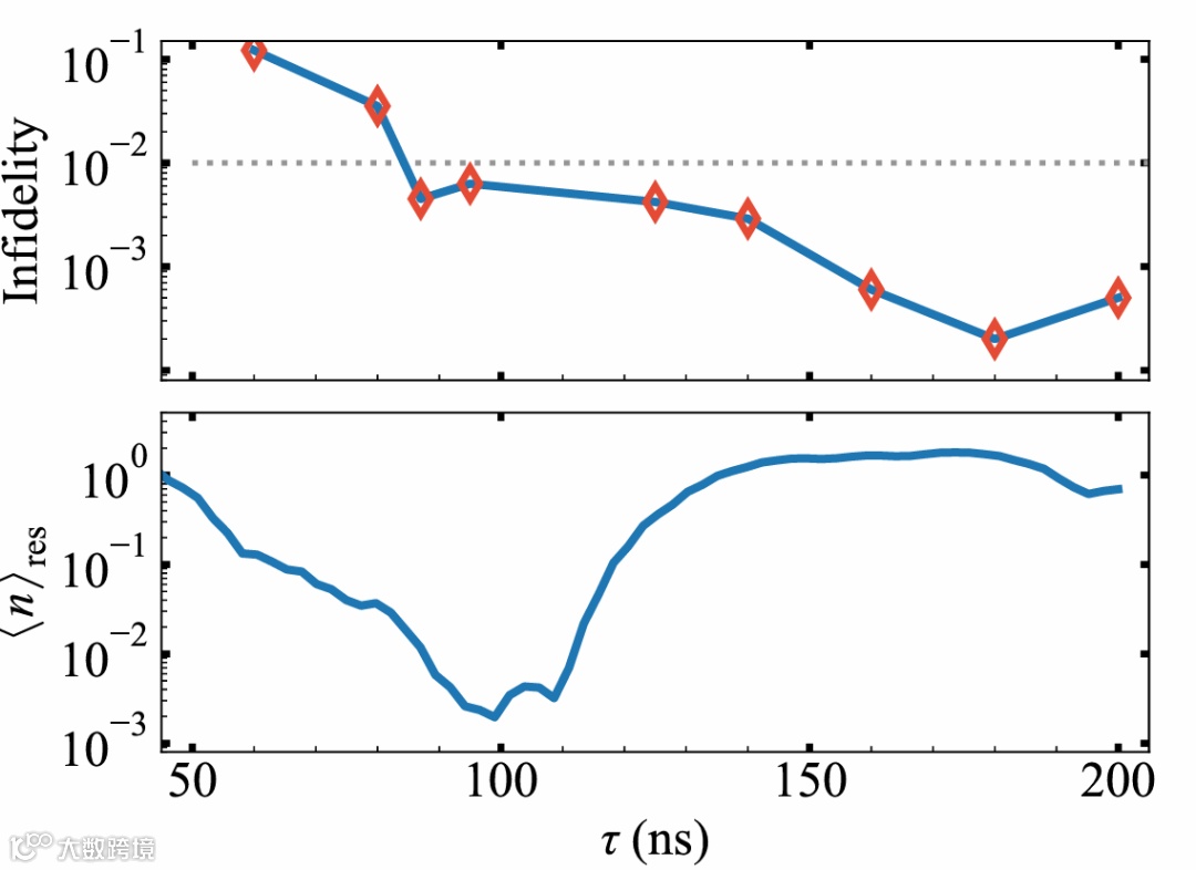 图2:在FSR = 1.4 GHz时实现CZ门的保真度和FSR = 0.2 GHz时谐振腔内残余光子数。