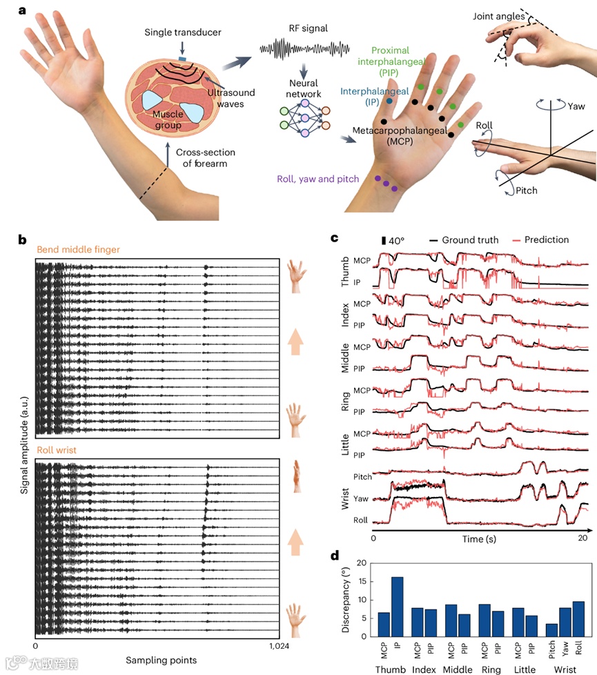 单个传感器可以在约6.6cm的等效深度捕捉肌肉的运动。收集成对射频信号和手势的训练数据集。地面真实手势是通过一个商业开发套件获得的。然后将新的射频信号输入训练好的神经网络,以跟踪动态手势。下图b显示了放松状态下的射频信号,然后弯曲中指并旋转手腕。每个面板包含20个RF信号,每个RF信号包含1024个数据点。初始反射峰对应于浅层肌肉,而随后的峰值属于深层肌肉。这些峰值的变化定性地揭示了肌肉运动。神经网络在前面包括八层一维卷积,每层卷积后都有一个校正的线性单元激活层。然后,数据通过一个平坦层、一个丢失层(丢失率为0.2)和两个全连接层。在每个完全连接的层之后,集成了基于整流线性单元的激活函数。最后一层产生了13个不同的自由度作为输出。在代表20秒连续手部运动的1000帧超声信号上测试了训练好的神经网络的性能,将神经网络预测的动态手部运动(红色曲线)叠加在地面真实值(黑色曲线)上进行比较,所有13个自由度的预测差异平均值仅为~7.9°。这些结果证实,单个传感器可以准确地跟踪动态手势。