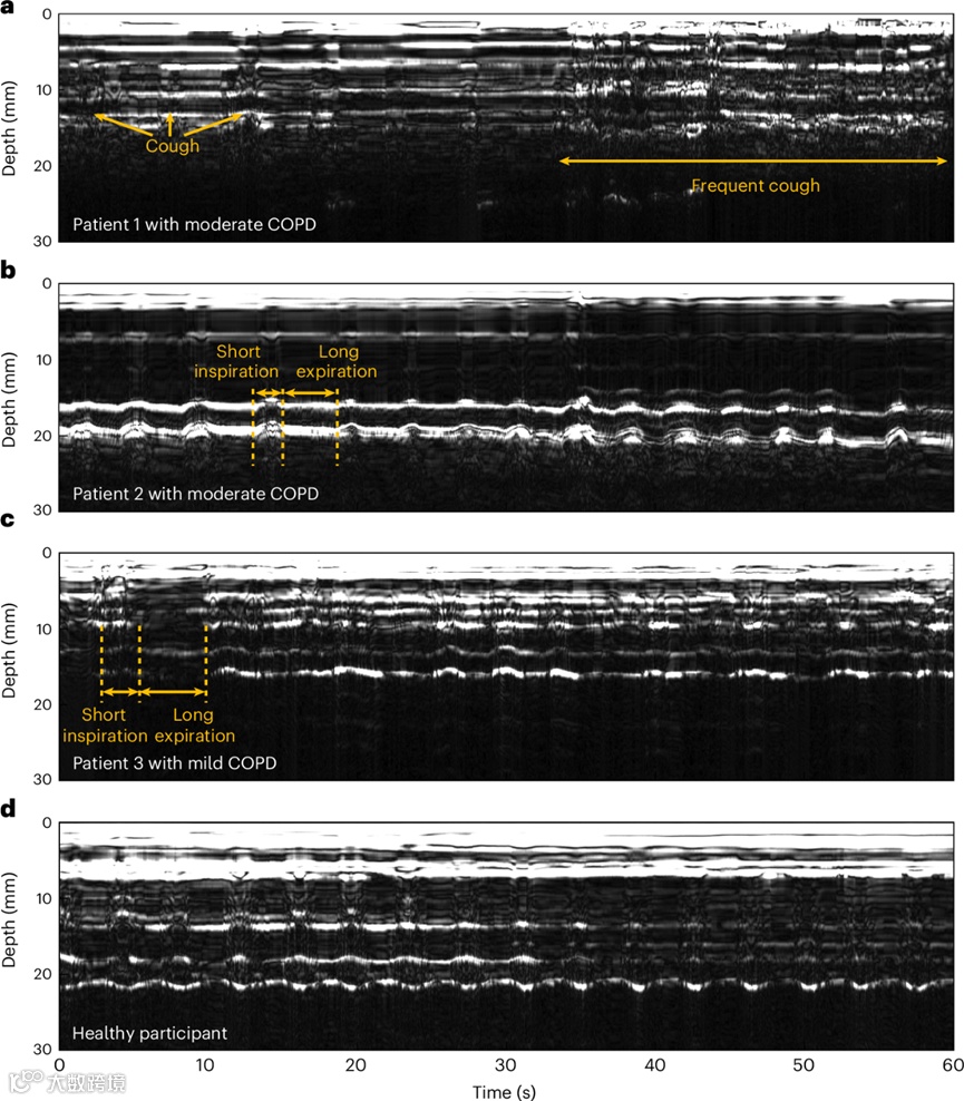 招募了三名慢性阻塞性肺病(COPD)患者,他们的肺气道发炎、变窄,并在呼气期趋于塌陷。在这种情况下,身体通过咳嗽迫使空气通过气道。此外,呼吸的呼气阶段通常会延长。患者1的呼吸相对较浅,咳嗽频繁,导致单传感器采集的M模式图像中隔膜轻微移动。由于咳嗽是主要症状,M型图像显示频繁波动。患者2有非常典型的吸气时间短和呼气时间长的症状。由于患者3患有轻度慢性阻塞性肺病,症状轻微,M模式图像显示吸气和呼气都有规律,只有偶尔长时间呼气。在健康的参与者中,吸气期和呼气期相对一致。这些结果表明,单个传感器可以区分健康参与者和慢性阻塞性肺疾病患者的呼吸模式,显示出其临床潜力。
