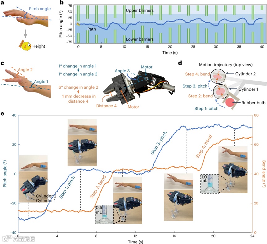 为了演示手势的快速响应和动态跟踪,将单个传感器作为人机界面来控制虚拟对象和机器人手臂。虚拟飞鸟的高度由手腕俯仰角控制,能够通过一系列障碍物连续控制鸟的轨迹。还使用单个传感器作为手势和机器人手臂之间的接口,将手腕俯仰角和食指掌指关节角分别与机器人手臂的旋转角和夹紧距离相关联。为了实现设计的运动轨迹,单个传感器必须连续跟踪手腕俯仰角(蓝色曲线)和食指弯曲角(橙色曲线)。通过这些操作,机器人手臂可以将受控量的水放入两个刻度量筒中。下图e显示了五种典型的手势和相应的机器人手臂状态。所有这些复杂的手势都被完全集成的单传感器EcMG系统捕获,以控制机器人手臂。