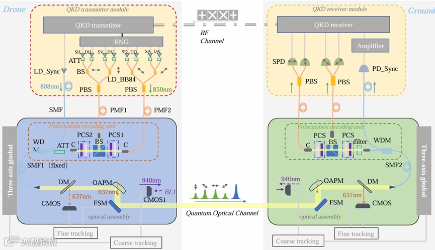 面向移动平台偏振编码量子密钥分发的应用需求,研究者们通过在无人机端引入额外的保偏光纤路径,利用混合编码的方案发展了全套无需实时校准的动中通偏振控制与保持技术。完整光路设计见图2。