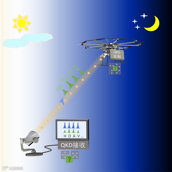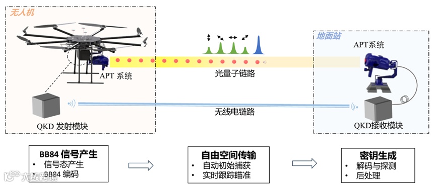 想要基于无人机移动平台实现量子密钥分发,系统的重量、体积、稳定性等方面面临多项技术挑战。研究者们通过若干核心技术的原创设计与研发成功解决了所有挑战,实现了首例无人机与地面站之间的量子密钥分发,实验的流程见图1。