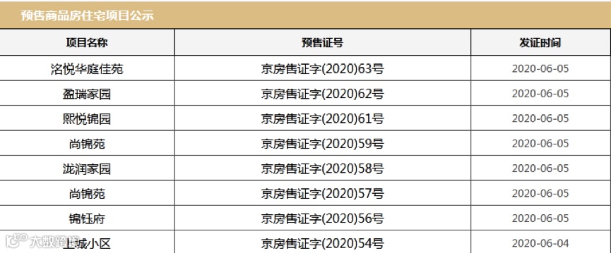 北京市本周下发的8个住宅项目预售证