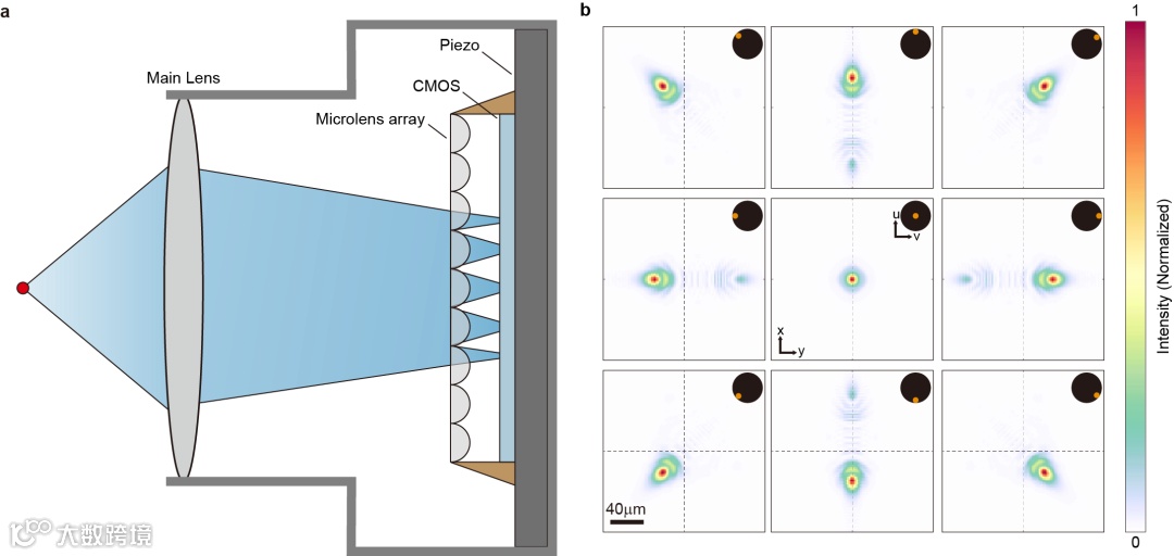 图1. 元成像相机的构建。a.元成像相机将主透镜、微透镜阵列、CMOS传感器和压电位移台集成在一起。b.元成像相机4D PSF中不同子孔径的图像。
