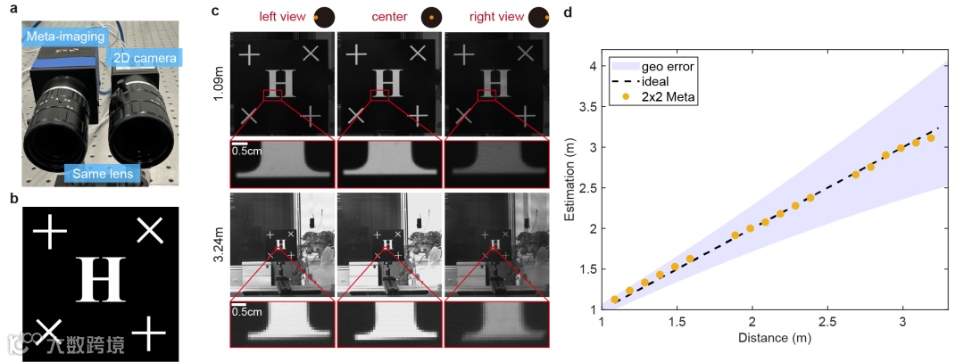 图2. 原型机与深度估计实验。a.元成像相机和2D相机,两者的镜头和传感器参数完全一致。b.标有“H”的目标板。c.元成像相机在不同距离下拍摄到的目标板图像,聚焦位置在2.48米。d.估计得到的目标板深度。“geo error”是指基于几何光学(视差)深度估计的理论误差。
