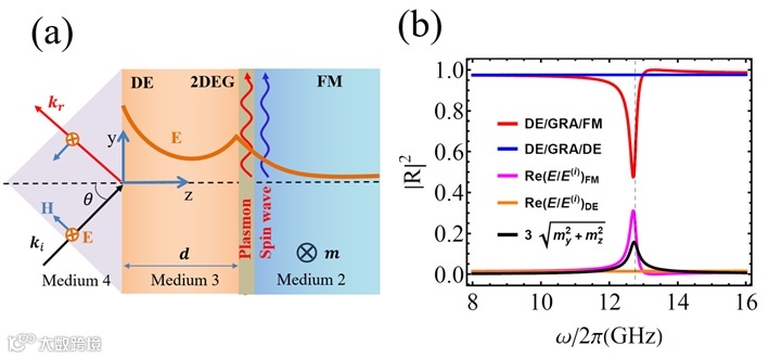 图2. (a)探测表面等离激元和自旋波激发的思路示意图。入射电磁波在介电层里产生的衰逝波在二维材料和磁层薄膜的界面诱导产生表面等离激元和自旋波。(b)入射电磁波在异质结界面的反射率随着频率的变化关系。表面等离激元和自旋波的联合激发会带走部分电磁能量,从而在系统反射谱上呈现深谷结构。