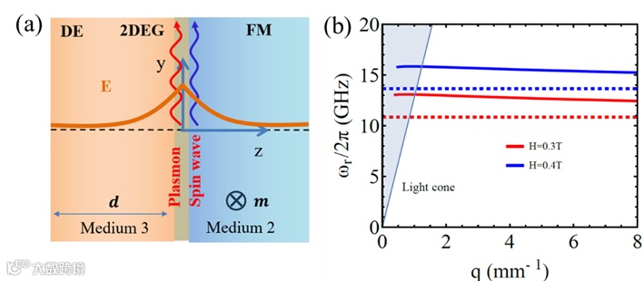 图1. (a) 介电质/二维材料/铁磁层的异质结示意图。铁磁层表面自旋波的激发诱导出二维材料中横电模式的表面等离激元。(b)自旋波和表面等离激元联合激发的色散关系。