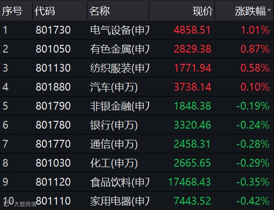 从板块来看,全市场共有1024只个股上涨,超过2600只个股下跌。28个申万一级行业中,前日表现强势的科技股回落,电气设备以1.01%涨幅领涨,有色金属、纺织服装、汽车翻红。