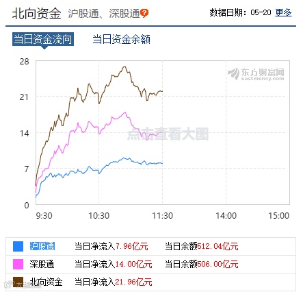 北向资金早盘再度入场抢筹。东方财富数据显示,截至午间收盘,北向资金累计净流入21.96亿元,其中沪股通净流入7.96亿元,深股通净流入14亿元。此前北向资金已连续3日保持净流入态势,累计净流入82.97亿元。