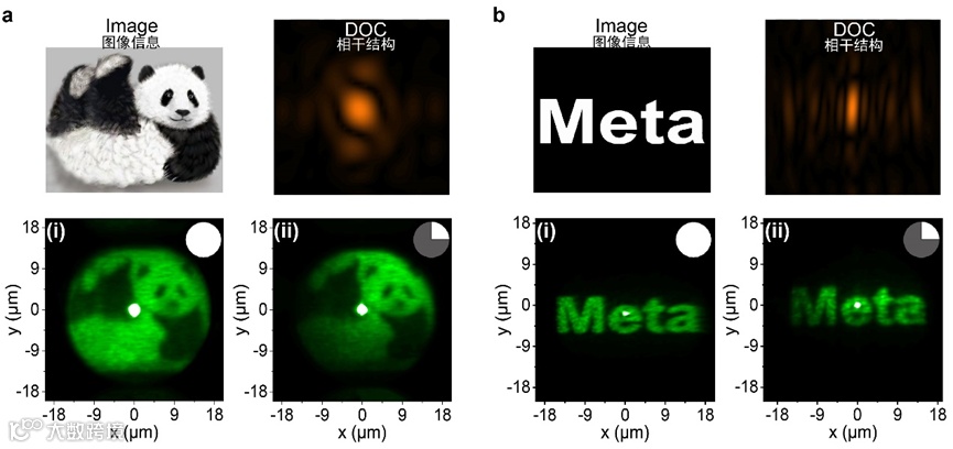 在光的传输过程中,散射体或障碍物往往会对光的路径产生显著影响,导致光束波前发生变化。然而,当这些经由随机超表面后生成的瞬时散斑光强在远场叠加时,除了障碍物导致的能量损失外,统计强度几乎与无障碍物的情形保持一致(图1d)。这一特性表明本文中所提出的超表面设计方案能够克服环境中的扰动,实现更为稳定和可靠的光场传输。此外,除了能够生成任意谢尔模型的光束之外,还能够利用本文中提出的超表面设计方案,将任意图像的信息加载到相干结构中,从而实现图像信息的鲁棒传输,如图2所示。经过障碍物遮挡后重建图像的分辨率与部分相干光束的相干长度密切相关。当相干长度被有效降低到足够低的水平时,分辨率主要受到衍射极限的限制。