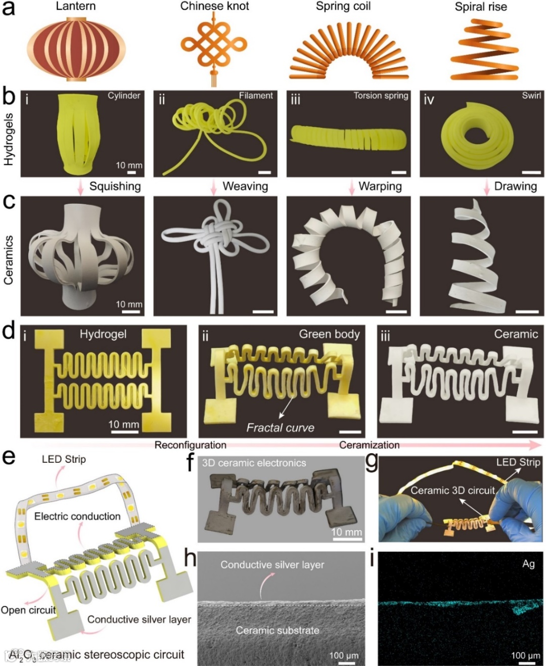 图3 水凝胶柔性骨架经过压缩、编织、弯曲和拉伸等连续的二次变形制造的高精度、大跨度复杂陶瓷结构及在立体电路中的应用
