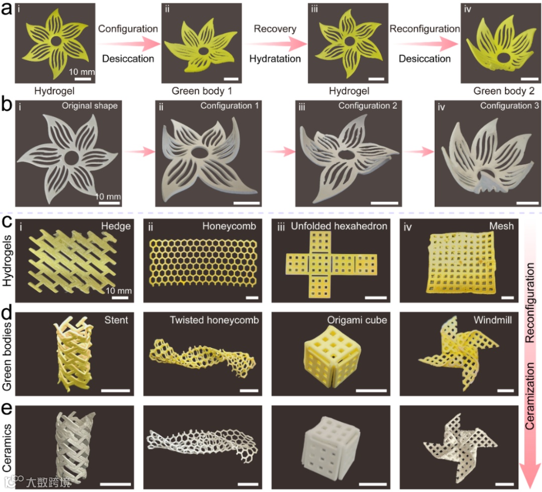 图2 3D打印2D水凝胶柔性骨架的变形重构实现的3D复杂陶瓷结构