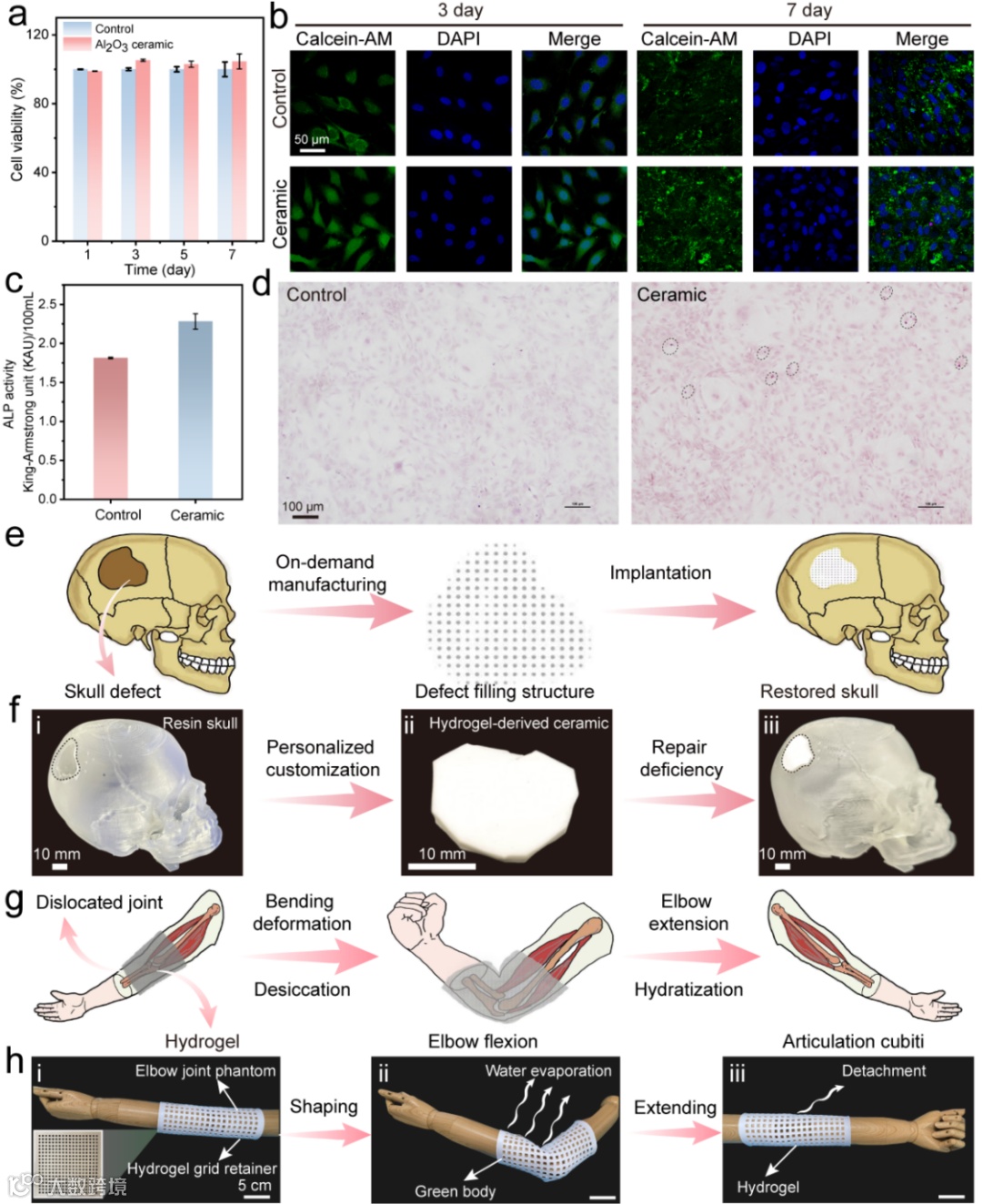 图4 水凝胶柔性骨架辅助制造的陶瓷材料的生物相容性与应用展示