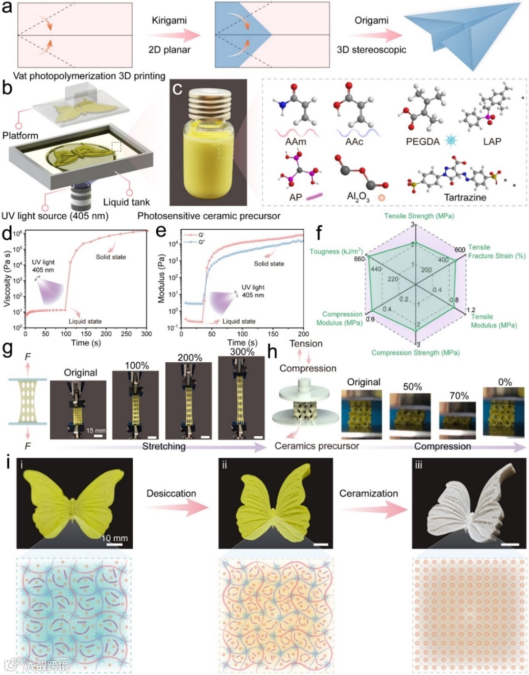 为了解决这一问题,中国科学院兰州化学物理研究所王晓龙研究员团队,受折纸/剪纸艺术启发,提出了一种利用3D 打印水凝胶柔性骨架辅助制造无支撑、大跨度复杂陶瓷结构的新方案。光固化3D打印水凝胶柔性骨架的二次变形重构制造的复杂陶瓷结构解决了传统陶瓷制造中因脆性和刚性导致的形状复杂性和尺寸收缩问题,具有显著的技术突破。该方法能够制造出具有高几何复杂性、高打印精度和形状保真度的陶瓷结构,突破了传统陶瓷制造方法的局限,展示了这种新型陶瓷结构在立体电路、生物医学和催化应用中的潜力,拓展了高精度制造的复杂陶瓷器件的应用范围。