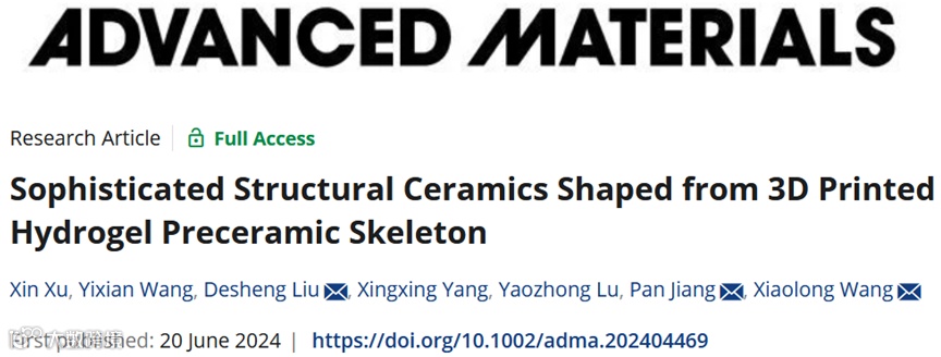 文章信息:Xin Xu, Yixian Wang, Desheng Liu*, Xingxing Yang, Yaozhong Lu, Pan Jiang*, and Xiaolong Wang*, Sophisticated Structural Ceramics Shaped from 3D Printed Hydrogel Preceramic Skeleton, Advanced Materials, 2024, 2404469.