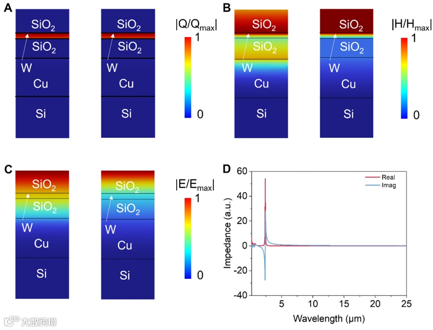 图3 有限元模拟分析。(A)能量损耗分布。(B)磁场分布。(C)电场分布。(D)阻抗特性。