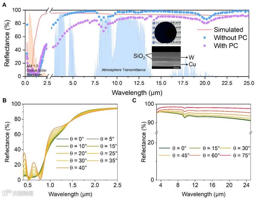 图2 仿生太阳能选择性吸收薄膜光学特性。(A)全光谱反射率。(B)太阳辐射波段变角度光谱。(C)红外波段变角度光谱。