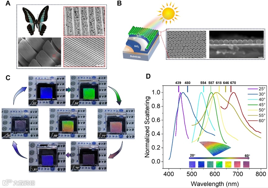 图1 受青凤蝶启发的多色选择性太阳能吸收薄膜。(A)青凤蝶蝶翅结构。(B)仿生结构示意图。(C)多彩结构色显现。(D)散射光谱图