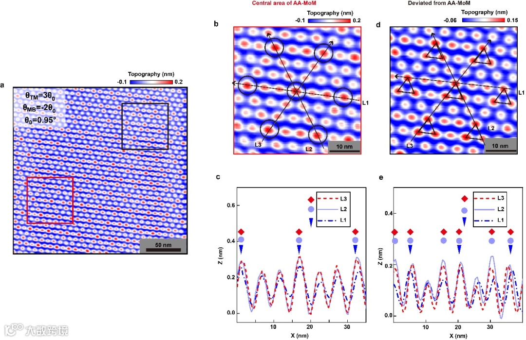 图2| a, 典型的莫尔准晶样品的STM形貌图。b, a中红框区域,即超莫尔的AA区域的放大图。c, b中沿三个不同方向的高度变化图。d, a中黑框区域,即偏离超莫尔AA近100nm的区域的放大图。e, d中沿三个不同方向的高度变化图。