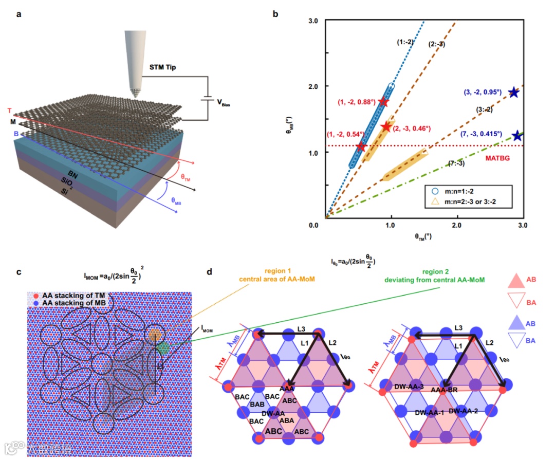 图1| a,三层转角石墨烯样品的 STM 装置示意图。b,在(θTM, θMB)比值为 (1, −2)、(2, −3) 和 (3, −2)下,理论得到的具有平带的魔转角。红星和蓝星代表该工作中的样品。c,(θTM, θMB)比值为(1,-2)的TTG 中超莫尔结构的示意图。黑色四边形代表超莫尔的单位元胞。圆圈代表超莫尔的AA区域,三角形代表 AB/BA区域,椭圆形代表 DW区域。d,(θTM, θMB)比值为(1,-2)的TTG中AA以及偏离AA区域的局域结构示意图。如图所示,C3z 旋转对称性在偏离AA区域处被破坏。
