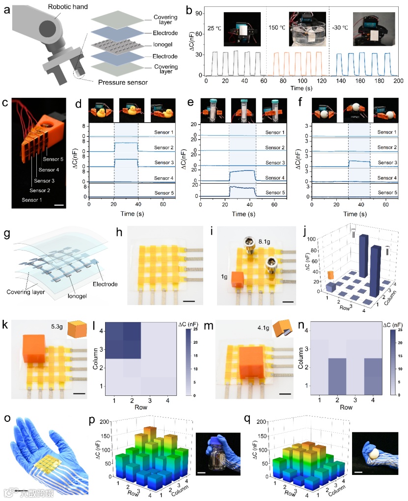 3D打印离子传感器具有良好的灵敏度和稳定性,在高温和低温环境下都具有良好的传感性能,将其集成到机械手上,可以在-30°C到150°C的宽温度范围内监测机械手抓取物体过程中的信号变化。由3D打印离子传感器组成的4 × 4传感阵列可精确识别物体的放置方位及物体与传感器之间的接触形状,具有良好的空间分辨率,能够应用于多种传感场景(图4)。