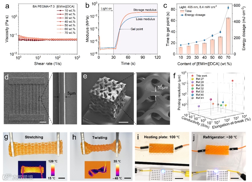 离子凝胶前驱体溶液粘度低、光固化速度快,能够很好的适配光固化3D打印系统。研究团队采用摩方精密nanoArch® S130(精度:2 μm)3D打印设备,可以打印出宽度为5 μm的高精度线条,以及特征尺寸为50 μm的复杂三维Gyroid结构,并利用摩方精密microArch® S240(精度:10 μm)3D打印设备打印了大尺寸的Octet truss结构。因为离子凝胶的在宽温度范围内具有良好的稳定性,所以3D打印的离子凝胶结构在高温和低温环境下都能保持良好的导电性和拉伸性(图2)。