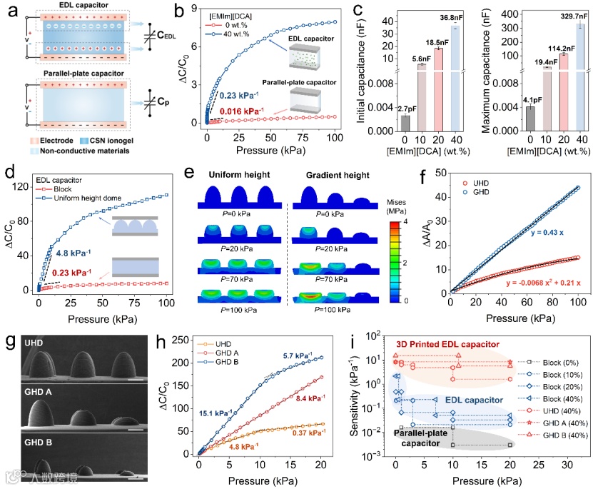 通过有限元模拟,研究团队发现梯度结构可以提高离子凝胶结构的可压缩性,利用摩方精密microArch® S240(精度:10 μm)3D打印设备打印了高精度的梯度半球结构,能够显著增加电极与离子凝胶结构之间的接触面积,可以改善离子电容传感器的灵敏度和线性度(图3)。3D打印离子电容传感器响应时间短,具有良好的机械耐久性,在长期或循环使用中能够保证稳定的信号输出。