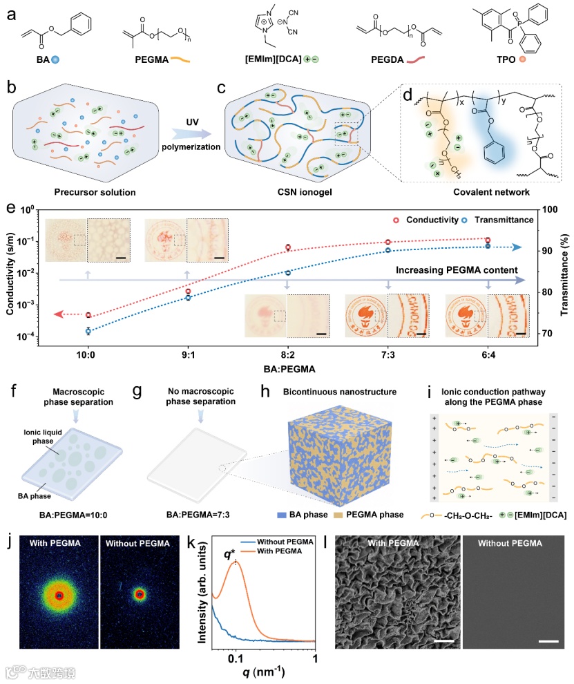 针对这一问题,南方科技大学机械与能源工程系葛锜教授开发了一种高电导率、大变形的光固化离子凝胶。通过光聚合诱导的微相分离策略,离子凝胶内部形成了导电纳米通道和交联聚合物骨架交错分布的双连续相纳米结构,在不牺牲材料力学性能的前提下,将离子凝胶的电导率提高到了3.2 S/m。