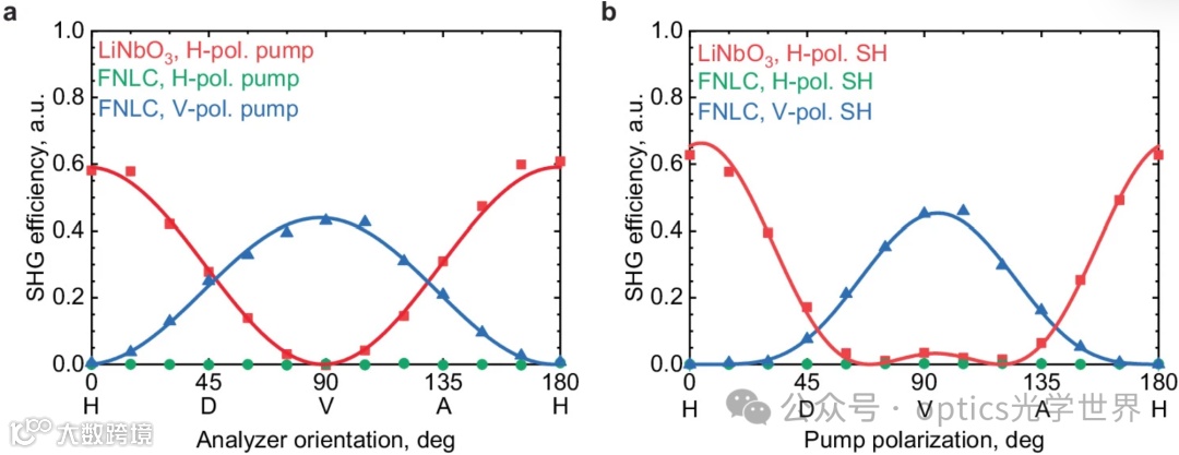 FNLC 的非线性程度取决于分子取向,其分子取向极为复杂且可被外部激励调控。为了研究 LC 中的光子对生成,作者制备了几个分子取向不同(0, , )的样品。