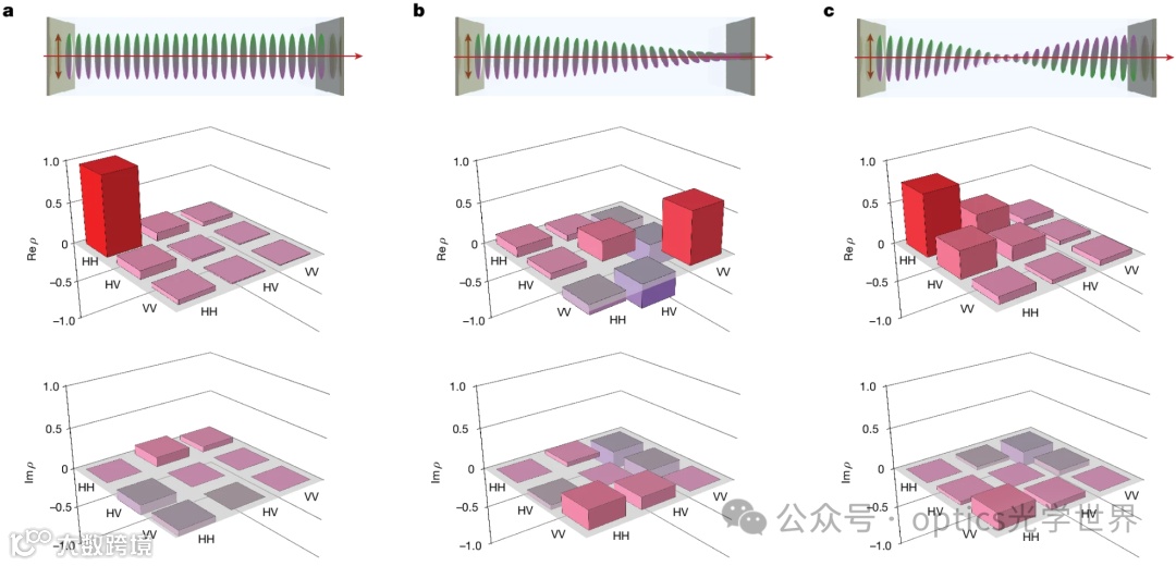 如果分子扭曲 (即分子取向从水平方向逐渐改变为垂直方向),双光子态完全不同:主要为 “VV” 光子对与一部分 “HV” 光子对;