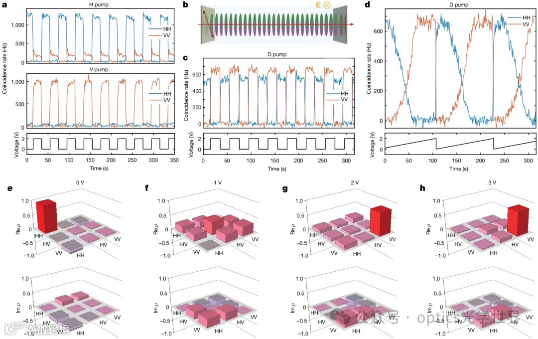 在这篇文章中,几大团队合作证实了 LC 中基于 SPDC 的纠缠光子的电可调光源。据作者所知,这是首次在液体或任何有机材料中观察到 SPDC;而且,SPDC 率相当高。作者表明双光子的偏振态可以通过沿样品的分子取向扭曲或施加的电场来改变。