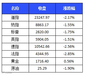 欧洲三大股指周三全线下跌。英国富时100指数下跌90.72点,跌幅1.51%,报收于5904.05点。法国CAC40指数下跌127.55点,跌幅2.85%,报收于4344.95点;德国DAX指数下跌276.84点,跌幅2.56%,报收于10542.66点。