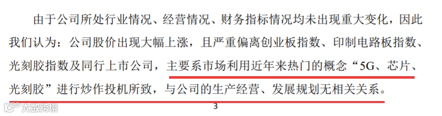容大感光在5月13日回复问询函时直言,公司所处行业情况、经营情况、财务指标情况均未出现重大变化,公司股价出现大幅上涨,且严重偏离创业板指数、印制电路板指数、光刻胶指数及同行上市公司,主要系市场利用近年来热门的概念“5G、芯片、光刻胶”进行炒作投机所致,与公司的生产经营、发展规划无相关关系。