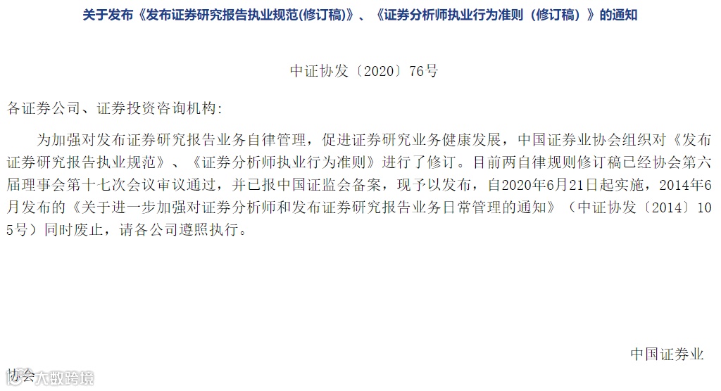 中国证券业协会5月22日晚间表示,为加强对发布证券研究报告业务自律管理,协会组织对《发布证券研究报告执业规范》、《证券分析师执业行为准则》进行了修订。两自律规则修订稿自2020年6月21日起实施。