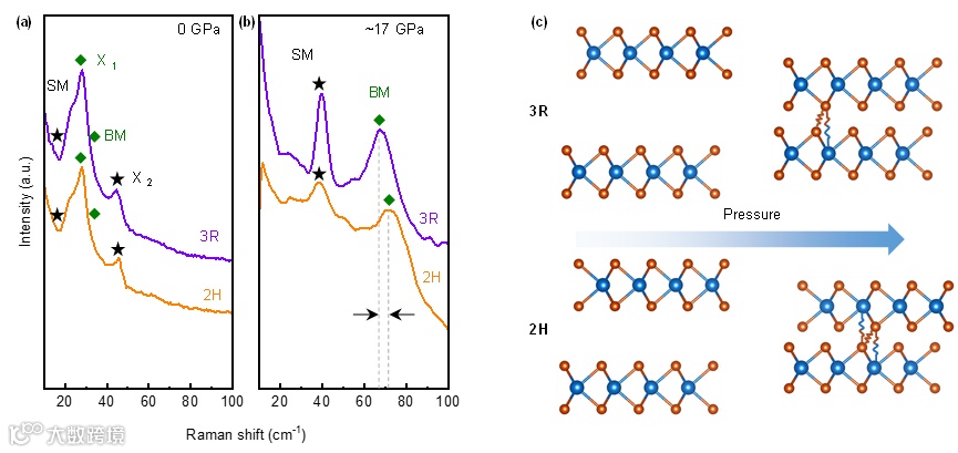 二维WS2超低波数拉曼光谱超低波数展现出的压强诱导的堆垛对称性