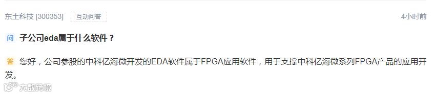 5月28日下午,东土科技在深交所互动易平台表示,公司参股的中科亿海微开发的EDA软件属于FPGA应用软件,用于支撑中科亿海微系列FPGA产品的应用开发。