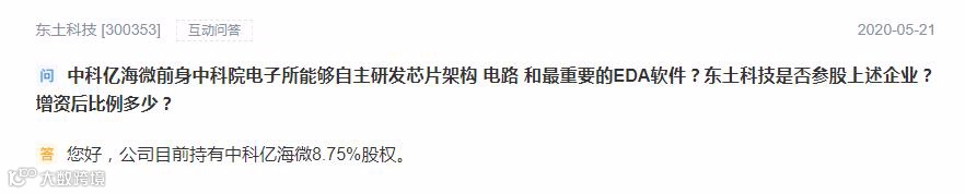 5月21日,东土科技在互动易上回复投资者提问时表示,公司目前持有中科亿海微8.75%股权。