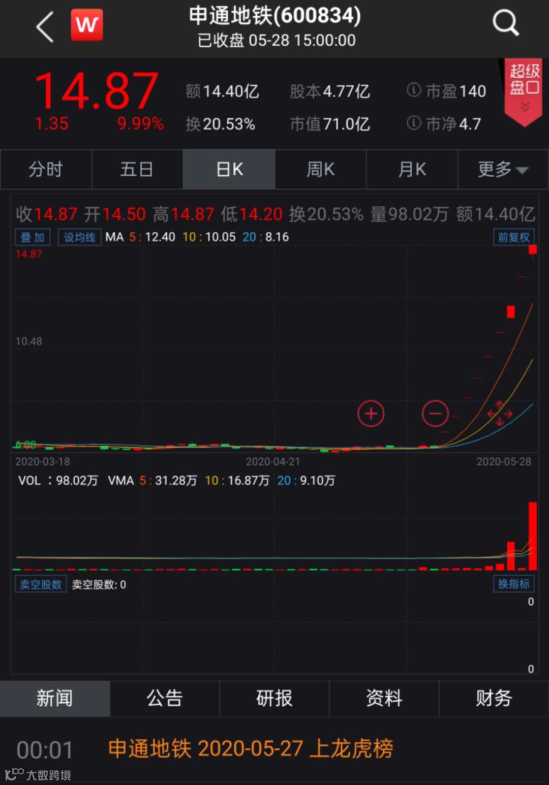 受EDA软件概念影响,A股公司申通地铁股价大涨,5月28日,申通地铁涨停。Wind数据显示,5月18日至28日,申通地铁股价已连续9个交易日涨停。申通地铁股价自5月15日收盘的6.31元,上涨至5月28日的14.87元,涨幅高达135.66%。