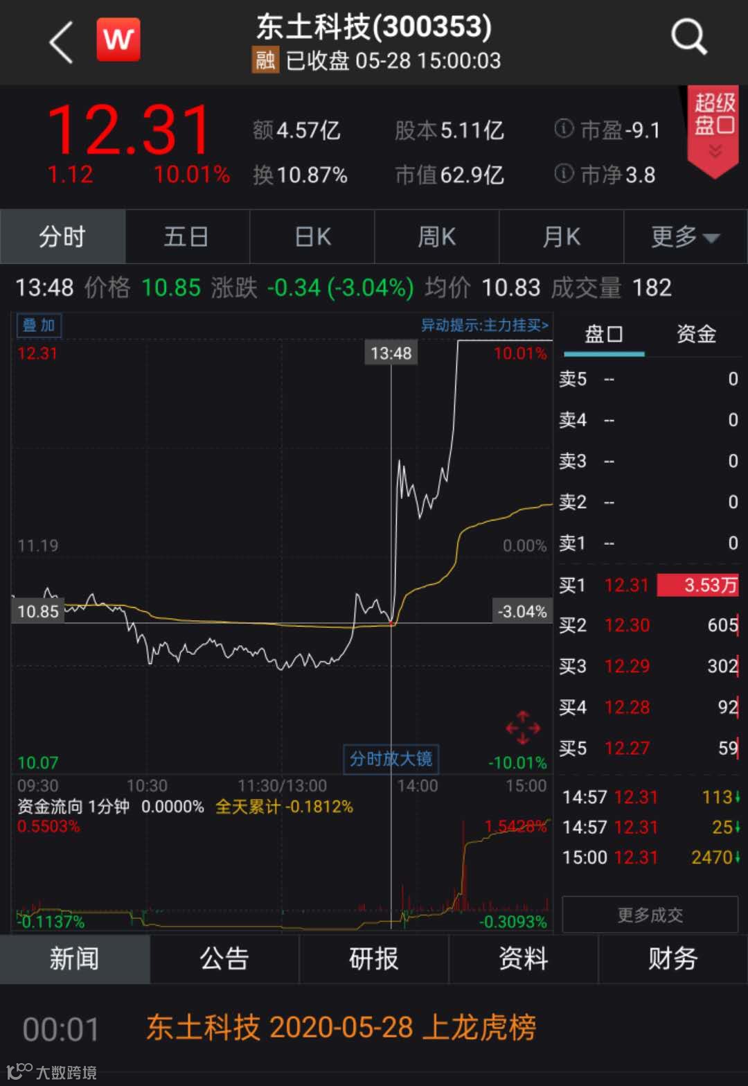 此消息一经披露,二级市场闻风而动。Wind数据显示,东土科技13点48分开始迅速拉升,14时18分左右封上涨停板,全天成交39.9万手,换手率为10.87%,成交额达4.57亿元。