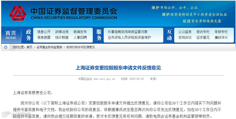 日前证监会官网公布披露上海证券变更控股股东申请文件反馈意见。