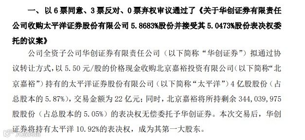 2019年11月15日,华创阳安公告称,公司董事会审议通过了关于收购太平洋证券5.87%股份并接受其5.05%股份表决权委托的议案。本次交易后,华创证券将持有太平洋证券10.92%的表决权,成为其第一大股东。华创阳安也明确表示,有意向取得太平洋证券实际控制权。