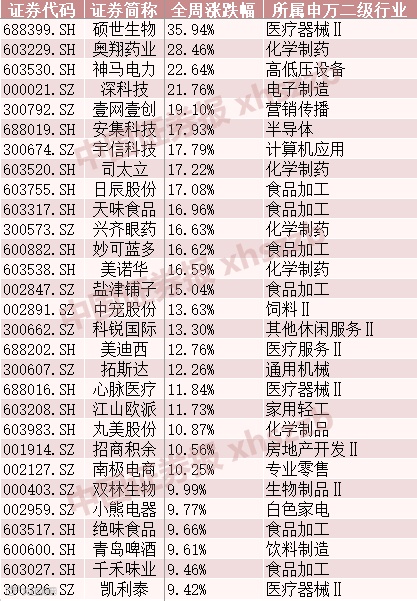 本周涨幅居前的部分股价创新高个股