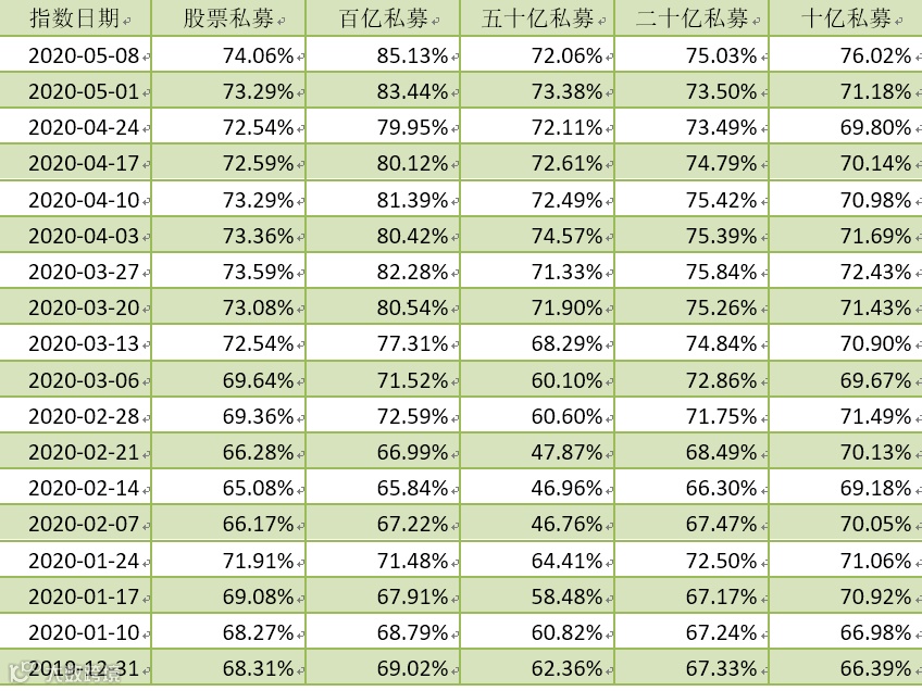 分规模来看,5月8日当周,小型私募机构的加仓幅度领先于其他规模私募;10亿级私募(指管理资产规模在10亿元以上的私募),大幅加仓了4.84个百分点至75.02%。