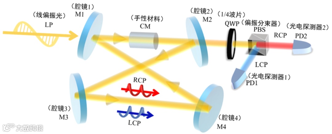 图2显示了CECEM光谱法的实现原理。研究人员将一束线偏振光耦合进蝶形腔内,同时激发起腔内LCP和RCP本征模式。然后,扫描输入激光的频率并分别测量LCP和RCP本征模式的透射光谱。在没有手性材料的情况下,这两种模式在共振频率和线宽上将是简并的。如果有手性材料存在,共振频率和线宽的简并现象就会消失。手性材料的ORD会引起腔内LCP和RCP产生不同的相移,导致它们共振频率不同,即ORD与LCP和RCP本征模之间的频率分裂成正比。手性材料的CD会引起腔内LCP和RCP产生不同的损耗,导致它们透射峰不同,即CD与两个本征光谱的透射峰的比值成正比。此外,由于LCP和RCP本征模式的透射谱分别由两个不同光路的探测器探测,所以该方法也可以同时探测到极弱的ORD和CD信号。